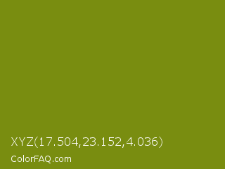 XYZ 17.504,23.152,4.036 Color is a normal yellow color and the nearest color is Trendy Green #7c881a. Hex code #798d10 and RGB value is rgb(121,141,16). In RGB color space, this color is composed of 47% red, 55% green, 6% blue, In CMYK color space, this color is composed of 14% cyan, 0% magenta, 89% yellow , 45% black , In HSL color space, this color has a hue angle of 70° , 80% saturation and 31% lightness.