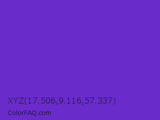 XYZ 17.506,9.116,57.337 Color is a normal violet color and the nearest color is Purple Heart Crayola #652dc1. Hex code #692ccb and RGB value is rgb(105,44,203). In RGB color space, this color is composed of 41% red, 17% green, 80% blue, In CMYK color space, this color is composed of 48% cyan, 78% magenta, 0% yellow , 20% black , In HSL color space, this color has a hue angle of 263° , 64% saturation and 48% lightness.