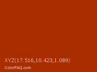 XYZ 17.516,10.423,1.089 Color is a normal orange color and the nearest color is Rufous #a81c07. Hex code #aa2d00 and RGB value is rgb(170,45,0). In RGB color space, this color is composed of 67% red, 18% green, 0% blue, In CMYK color space, this color is composed of 0% cyan, 74% magenta, 100% yellow , 33% black , In HSL color space, this color has a hue angle of 16° , 100% saturation and 33% lightness.