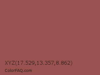 XYZ 17.529,13.357,8.862 Color is a normal red color and the nearest color is Middle Red Purple #a55353. Hex code #99524e and RGB value is rgb(153,82,78). In RGB color space, this color is composed of 60% red, 32% green, 31% blue, In CMYK color space, this color is composed of 0% cyan, 46% magenta, 49% yellow , 40% black , In HSL color space, this color has a hue angle of 3° , 32% saturation and 45% lightness.