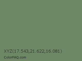 XYZ 17.543,21.622,16.081 Color is a normal green color and the nearest color is Highland #6f8e63. Hex code #6e8767 and RGB value is rgb(110,135,103). In RGB color space, this color is composed of 43% red, 53% green, 40% blue, In CMYK color space, this color is composed of 19% cyan, 0% magenta, 24% yellow , 47% black , In HSL color space, this color has a hue angle of 107° , 13% saturation and 47% lightness.