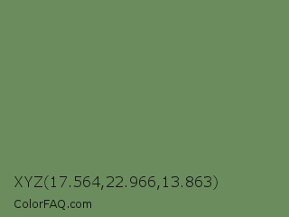 XYZ 17.564,22.966,13.863 Color is a normal green color and the nearest color is Highland #6f8e63. Hex code #6b8d5d and RGB value is rgb(107,141,93). In RGB color space, this color is composed of 42% red, 55% green, 36% blue, In CMYK color space, this color is composed of 24% cyan, 0% magenta, 34% yellow , 45% black , In HSL color space, this color has a hue angle of 103° , 21% saturation and 46% lightness.