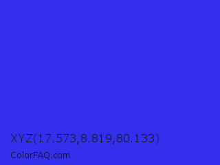 XYZ 17.573,8.819,80.133 Color is a normal indigo color and the nearest color is Palatinate Blue #273be2. Hex code #342fec and RGB value is rgb(52,47,236). In RGB color space, this color is composed of 20% red, 18% green, 93% blue, In CMYK color space, this color is composed of 78% cyan, 80% magenta, 0% yellow , 7% black , In HSL color space, this color has a hue angle of 242° , 83% saturation and 55% lightness.