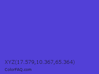 XYZ 17.579,10.367,65.364 Color is a normal indigo color and the nearest color is Iris #5a4fcf. Hex code #5240d7 and RGB value is rgb(82,64,215). In RGB color space, this color is composed of 32% red, 25% green, 84% blue, In CMYK color space, this color is composed of 62% cyan, 70% magenta, 0% yellow , 16% black , In HSL color space, this color has a hue angle of 247° , 65% saturation and 55% lightness.