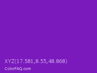 XYZ 17.581,8.55,48.868 Color is a normal purple color and the nearest color is Purple Heart Crayola #652dc1. Hex code #7a1abd and RGB value is rgb(122,26,189). In RGB color space, this color is composed of 48% red, 10% green, 74% blue, In CMYK color space, this color is composed of 35% cyan, 86% magenta, 0% yellow , 26% black , In HSL color space, this color has a hue angle of 275° , 76% saturation and 42% lightness.