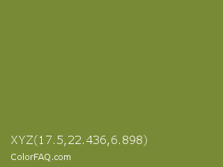 XYZ 17.5,22.436,6.898 Color is a normal lime color and the nearest color is Wasabi #788a25. Hex code #788a36 and RGB value is rgb(120,138,54). In RGB color space, this color is composed of 47% red, 54% green, 21% blue, In CMYK color space, this color is composed of 13% cyan, 0% magenta, 61% yellow , 46% black , In HSL color space, this color has a hue angle of 73° , 44% saturation and 38% lightness.