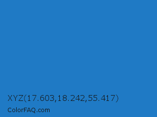 XYZ 17.603,18.242,55.417 Color is a normal blue color and the nearest color is Bright Navy Blue #1974d2. Hex code #1f7ac5 and RGB value is rgb(31,122,197). In RGB color space, this color is composed of 12% red, 48% green, 77% blue, In CMYK color space, this color is composed of 84% cyan, 38% magenta, 0% yellow , 23% black , In HSL color space, this color has a hue angle of 207° , 73% saturation and 45% lightness.