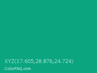XYZ 17.605,28.876,24.724 Color is a normal cyan color and the nearest color is Niagara #06a189. Hex code #0ba67f and RGB value is rgb(11,166,127). In RGB color space, this color is composed of 4% red, 65% green, 50% blue, In CMYK color space, this color is composed of 93% cyan, 0% magenta, 23% yellow , 35% black , In HSL color space, this color has a hue angle of 165° , 88% saturation and 35% lightness.