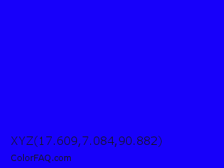 XYZ 17.609,7.084,90.882 Color is a normal indigo color and the nearest color is Blue #0000ff. Hex code #1700fa and RGB value is rgb(23,0,250). In RGB color space, this color is composed of 9% red, 0% green, 98% blue, In CMYK color space, this color is composed of 91% cyan, 100% magenta, 0% yellow , 2% black , In HSL color space, this color has a hue angle of 246° , 100% saturation and 49% lightness.