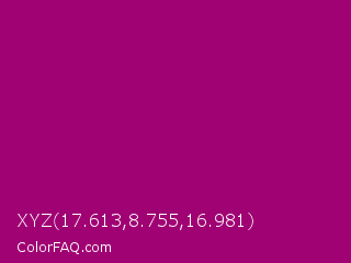 XYZ 17.613,8.755,16.981 Color is a normal magenta color and the nearest color is Flirt #a2006d. Hex code #a00273 and RGB value is rgb(160,2,115). In RGB color space, this color is composed of 63% red, 1% green, 45% blue, In CMYK color space, this color is composed of 0% cyan, 99% magenta, 28% yellow , 37% black , In HSL color space, this color has a hue angle of 317° , 98% saturation and 32% lightness.
