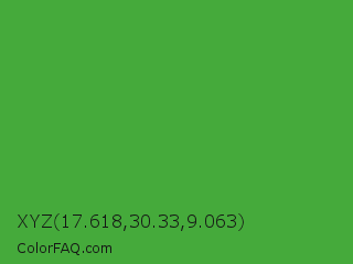 XYZ 17.618,30.33,9.063 Color is a normal green color and the nearest color is Apple #4fa83d. Hex code #45aa3b and RGB value is rgb(69,170,59). In RGB color space, this color is composed of 27% red, 67% green, 23% blue, In CMYK color space, this color is composed of 59% cyan, 0% magenta, 65% yellow , 33% black , In HSL color space, this color has a hue angle of 115° , 48% saturation and 45% lightness.