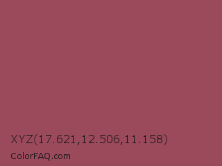 XYZ 17.621,12.506,11.158 Color is a normal red color and the nearest color is Vin Rouge #983d61. Hex code #9a4a5a and RGB value is rgb(154,74,90). In RGB color space, this color is composed of 60% red, 29% green, 35% blue, In CMYK color space, this color is composed of 0% cyan, 52% magenta, 42% yellow , 40% black , In HSL color space, this color has a hue angle of 348° , 35% saturation and 45% lightness.