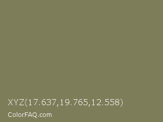 XYZ 17.637,19.765,12.558 Color is a normal yellow color and the nearest color is Flax Smoke #7b8265. Hex code #7d7d5a and RGB value is rgb(125,125,90). In RGB color space, this color is composed of 49% red, 49% green, 35% blue, In CMYK color space, this color is composed of 0% cyan, 0% magenta, 28% yellow , 51% black , In HSL color space, this color has a hue angle of 60° , 16% saturation and 42% lightness.