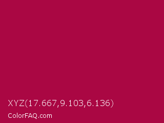 XYZ 17.667,9.103,6.136 Color is a normal rose color and the nearest color is Shiraz #b20931. Hex code #aa0743 and RGB value is rgb(170,7,67). In RGB color space, this color is composed of 67% red, 3% green, 26% blue, In CMYK color space, this color is composed of 0% cyan, 96% magenta, 61% yellow , 33% black , In HSL color space, this color has a hue angle of 338° , 92% saturation and 35% lightness.