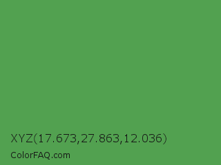 XYZ 17.673,27.863,12.036 Color is a normal green color and the nearest color is Fruit Salad #4f9d5d. Hex code #52a150 and RGB value is rgb(82,161,80). In RGB color space, this color is composed of 32% red, 63% green, 31% blue, In CMYK color space, this color is composed of 49% cyan, 0% magenta, 50% yellow , 37% black , In HSL color space, this color has a hue angle of 119° , 34% saturation and 47% lightness.