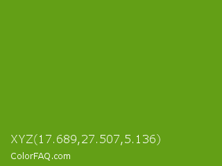 XYZ 17.689,27.507,5.136 Color is a normal green color and the nearest color is Christi #67a712. Hex code #639f16 and RGB value is rgb(99,159,22). In RGB color space, this color is composed of 39% red, 62% green, 9% blue, In CMYK color space, this color is composed of 38% cyan, 0% magenta, 86% yellow , 38% black , In HSL color space, this color has a hue angle of 86° , 76% saturation and 35% lightness.