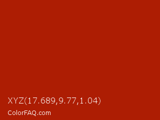 XYZ 17.689,9.77,1.04 Color is a normal red color and the nearest color is Rufous #a81c07. Hex code #ad1d03 and RGB value is rgb(173,29,3). In RGB color space, this color is composed of 68% red, 11% green, 1% blue, In CMYK color space, this color is composed of 0% cyan, 83% magenta, 98% yellow , 32% black , In HSL color space, this color has a hue angle of 9° , 97% saturation and 35% lightness.