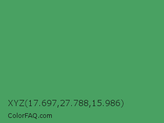XYZ 17.697,27.788,15.986 Color is a normal green color and the nearest color is Fruit Salad #4f9d5d. Hex code #49a162 and RGB value is rgb(73,161,98). In RGB color space, this color is composed of 29% red, 63% green, 38% blue, In CMYK color space, this color is composed of 55% cyan, 0% magenta, 39% yellow , 37% black , In HSL color space, this color has a hue angle of 137° , 38% saturation and 46% lightness.