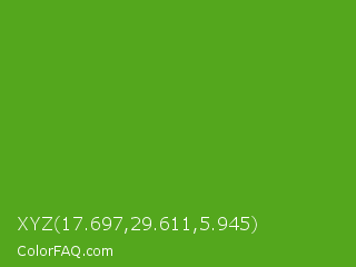 XYZ 17.697,29.611,5.945 Color is a normal green color and the nearest color is Christi #67a712. Hex code #54a71d and RGB value is rgb(84,167,29). In RGB color space, this color is composed of 33% red, 65% green, 11% blue, In CMYK color space, this color is composed of 50% cyan, 0% magenta, 83% yellow , 35% black , In HSL color space, this color has a hue angle of 96° , 70% saturation and 38% lightness.
