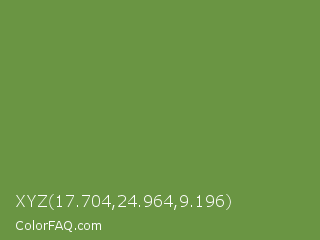 XYZ 17.704,24.964,9.196 Color is a normal green color and the nearest color is Palm Leaf #6f9940. Hex code #6a9543 and RGB value is rgb(106,149,67). In RGB color space, this color is composed of 42% red, 58% green, 26% blue, In CMYK color space, this color is composed of 29% cyan, 0% magenta, 55% yellow , 42% black , In HSL color space, this color has a hue angle of 91° , 38% saturation and 42% lightness.
