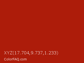 XYZ 17.704,9.737,1.233 Color is a normal red color and the nearest color is Rufous #a81c07. Hex code #ad1c0a and RGB value is rgb(173,28,10). In RGB color space, this color is composed of 68% red, 11% green, 4% blue, In CMYK color space, this color is composed of 0% cyan, 84% magenta, 94% yellow , 32% black , In HSL color space, this color has a hue angle of 7° , 89% saturation and 36% lightness.