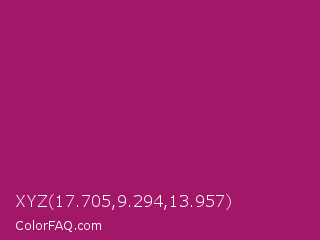 XYZ 17.705,9.294,13.957 Color is a normal magenta color and the nearest color is Jazzberry Jam #a50b5e. Hex code #a21768 and RGB value is rgb(162,23,104). In RGB color space, this color is composed of 64% red, 9% green, 41% blue, In CMYK color space, this color is composed of 0% cyan, 86% magenta, 36% yellow , 36% black , In HSL color space, this color has a hue angle of 325° , 75% saturation and 36% lightness.