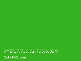 XYZ 17.716,32.735,6.824 Color is a normal green color and the nearest color is Wageningen Green #34b233. Hex code #36b221 and RGB value is rgb(54,178,33). In RGB color space, this color is composed of 21% red, 70% green, 13% blue, In CMYK color space, this color is composed of 70% cyan, 0% magenta, 81% yellow , 30% black , In HSL color space, this color has a hue angle of 111° , 69% saturation and 41% lightness.