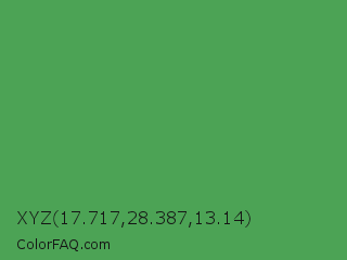 XYZ 17.717,28.387,13.14 Color is a normal green color and the nearest color is Fruit Salad #4f9d5d. Hex code #4ca355 and RGB value is rgb(76,163,85). In RGB color space, this color is composed of 30% red, 64% green, 33% blue, In CMYK color space, this color is composed of 53% cyan, 0% magenta, 48% yellow , 36% black , In HSL color space, this color has a hue angle of 126° , 36% saturation and 47% lightness.