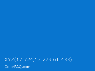 XYZ 17.724,17.279,61.433 Color is a normal blue color and the nearest color is True Blue #0073cf. Hex code #0875cf and RGB value is rgb(8,117,207). In RGB color space, this color is composed of 3% red, 46% green, 81% blue, In CMYK color space, this color is composed of 96% cyan, 43% magenta, 0% yellow , 19% black , In HSL color space, this color has a hue angle of 207° , 93% saturation and 42% lightness.