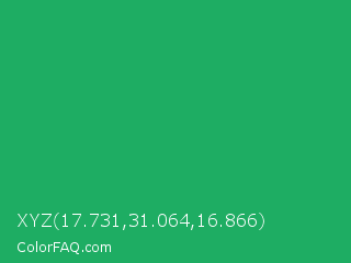 XYZ 17.731,31.064,16.866 Color is a normal green color and the nearest color is Green Crayola #1cac78. Hex code #1ead63 and RGB value is rgb(30,173,99). In RGB color space, this color is composed of 12% red, 68% green, 39% blue, In CMYK color space, this color is composed of 83% cyan, 0% magenta, 43% yellow , 32% black , In HSL color space, this color has a hue angle of 149° , 70% saturation and 40% lightness.