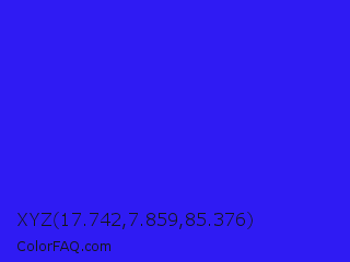 XYZ 17.742,7.859,85.376 Color is a normal indigo color and the nearest color is Bluebonnet #1c1cf0. Hex code #2f1bf3 and RGB value is rgb(47,27,243). In RGB color space, this color is composed of 18% red, 11% green, 95% blue, In CMYK color space, this color is composed of 81% cyan, 89% magenta, 0% yellow , 5% black , In HSL color space, this color has a hue angle of 246° , 90% saturation and 53% lightness.