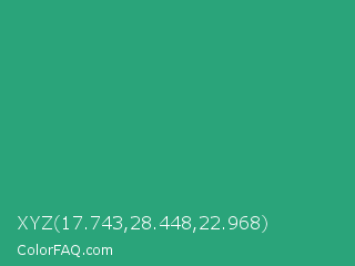 XYZ 17.743,28.448,22.968 Color is a normal green color and the nearest color is Jungle Green #29ab87. Hex code #2aa47a and RGB value is rgb(42,164,122). In RGB color space, this color is composed of 16% red, 64% green, 48% blue, In CMYK color space, this color is composed of 74% cyan, 0% magenta, 26% yellow , 36% black , In HSL color space, this color has a hue angle of 159° , 59% saturation and 40% lightness.