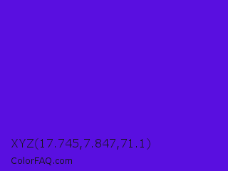 XYZ 17.745,7.847,71.1 Color is a normal violet color and the nearest color is Han Purple #5218fa. Hex code #590fe0 and RGB value is rgb(89,15,224). In RGB color space, this color is composed of 35% red, 6% green, 88% blue, In CMYK color space, this color is composed of 60% cyan, 93% magenta, 0% yellow , 12% black , In HSL color space, this color has a hue angle of 261° , 87% saturation and 47% lightness.