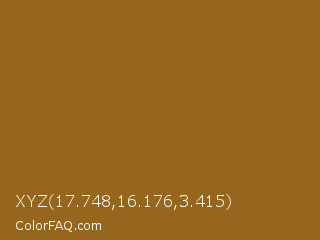 XYZ 17.748,16.176,3.415 Color is a normal orange color and the nearest color is Golden Brown #996515. Hex code #97661e and RGB value is rgb(151,102,30). In RGB color space, this color is composed of 59% red, 40% green, 12% blue, In CMYK color space, this color is composed of 0% cyan, 32% magenta, 80% yellow , 41% black , In HSL color space, this color has a hue angle of 36° , 67% saturation and 35% lightness.
