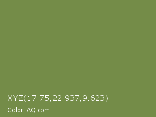 XYZ 17.75,22.937,9.623 Color is a normal green color and the nearest color is Palm Leaf #6f9940. Hex code #748c48 and RGB value is rgb(116,140,72). In RGB color space, this color is composed of 45% red, 55% green, 28% blue, In CMYK color space, this color is composed of 17% cyan, 0% magenta, 49% yellow , 45% black , In HSL color space, this color has a hue angle of 81° , 32% saturation and 42% lightness.