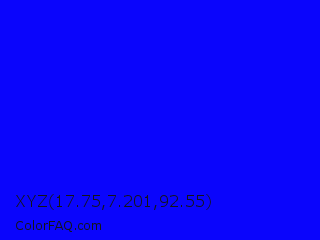 XYZ 17.75,7.201,92.55 Color is a normal indigo color and the nearest color is Blue #0000ff. Hex code #0a05fc and RGB value is rgb(10,5,252). In RGB color space, this color is composed of 4% red, 2% green, 99% blue, In CMYK color space, this color is composed of 96% cyan, 98% magenta, 0% yellow , 1% black , In HSL color space, this color has a hue angle of 241° , 98% saturation and 50% lightness.