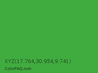 XYZ 17.764,30.954,9.741 Color is a normal green color and the nearest color is Apple #4fa83d. Hex code #40ac3f and RGB value is rgb(64,172,63). In RGB color space, this color is composed of 25% red, 67% green, 25% blue, In CMYK color space, this color is composed of 63% cyan, 0% magenta, 63% yellow , 33% black , In HSL color space, this color has a hue angle of 119° , 46% saturation and 46% lightness.