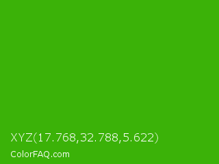 XYZ 17.768,32.788,5.622 Color is a normal green color and the nearest color is Kelly Green #4cbb17. Hex code #3bb208 and RGB value is rgb(59,178,8). In RGB color space, this color is composed of 23% red, 70% green, 3% blue, In CMYK color space, this color is composed of 67% cyan, 0% magenta, 96% yellow , 30% black , In HSL color space, this color has a hue angle of 102° , 91% saturation and 36% lightness.