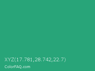 XYZ 17.781,28.742,22.7 Color is a normal green color and the nearest color is Green Crayola #1cac78. Hex code #28a579 and RGB value is rgb(40,165,121). In RGB color space, this color is composed of 16% red, 65% green, 47% blue, In CMYK color space, this color is composed of 76% cyan, 0% magenta, 27% yellow , 35% black , In HSL color space, this color has a hue angle of 159° , 61% saturation and 40% lightness.