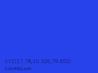 XYZ 17.78,10.326,79.653 Color is a normal blue color and the nearest color is Palatinate Blue #273be2. Hex code #2742eb and RGB value is rgb(39,66,235). In RGB color space, this color is composed of 15% red, 26% green, 92% blue, In CMYK color space, this color is composed of 83% cyan, 72% magenta, 0% yellow , 8% black , In HSL color space, this color has a hue angle of 232° , 83% saturation and 54% lightness.