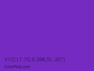 XYZ 17.79,9.288,51.307 Color is a normal violet color and the nearest color is Purple Heart Crayola #652dc1. Hex code #752ac1 and RGB value is rgb(117,42,193). In RGB color space, this color is composed of 46% red, 16% green, 76% blue, In CMYK color space, this color is composed of 39% cyan, 78% magenta, 0% yellow , 24% black , In HSL color space, this color has a hue angle of 270° , 64% saturation and 46% lightness.