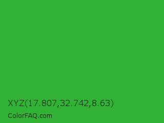 XYZ 17.807,32.742,8.63 Color is a normal green color and the nearest color is Wageningen Green #34b233. Hex code #31b234 and RGB value is rgb(49,178,52). In RGB color space, this color is composed of 19% red, 70% green, 20% blue, In CMYK color space, this color is composed of 72% cyan, 0% magenta, 71% yellow , 30% black , In HSL color space, this color has a hue angle of 121° , 57% saturation and 45% lightness.