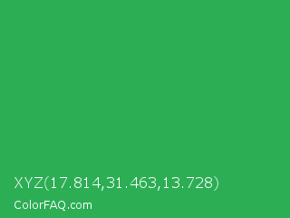XYZ 17.814,31.463,13.728 Color is a normal green color and the nearest color is Chateau Green #40a860. Hex code #2cae55 and RGB value is rgb(44,174,85). In RGB color space, this color is composed of 17% red, 68% green, 33% blue, In CMYK color space, this color is composed of 75% cyan, 0% magenta, 51% yellow , 32% black , In HSL color space, this color has a hue angle of 139° , 60% saturation and 43% lightness.