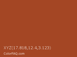 XYZ 17.818,12.4,3.123 Color is a normal orange color and the nearest color is Paarl #a65529. Hex code #a44624 and RGB value is rgb(164,70,36). In RGB color space, this color is composed of 64% red, 27% green, 14% blue, In CMYK color space, this color is composed of 0% cyan, 57% magenta, 78% yellow , 36% black , In HSL color space, this color has a hue angle of 16° , 64% saturation and 39% lightness.