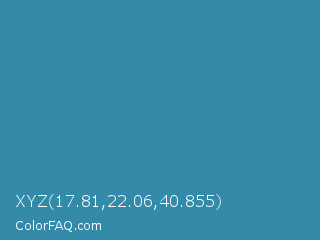 XYZ 17.81,22.06,40.855 Color is a normal blue color and the nearest color is Boston Blue #3b91b4. Hex code #348ba9 and RGB value is rgb(52,139,169). In RGB color space, this color is composed of 20% red, 55% green, 66% blue, In CMYK color space, this color is composed of 69% cyan, 18% magenta, 0% yellow , 34% black , In HSL color space, this color has a hue angle of 195° , 53% saturation and 43% lightness.