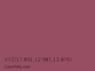 XYZ 17.831,12.987,12.876 Color is a normal red color and the nearest color is Vin Rouge #983d61. Hex code #984e61 and RGB value is rgb(152,78,97). In RGB color space, this color is composed of 60% red, 31% green, 38% blue, In CMYK color space, this color is composed of 0% cyan, 49% magenta, 36% yellow , 40% black , In HSL color space, this color has a hue angle of 345° , 32% saturation and 45% lightness.