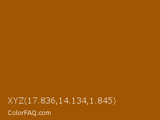 XYZ 17.836,14.134,1.845 Color is a normal orange color and the nearest color is Chelsea Gem #9e5302. Hex code #a05602 and RGB value is rgb(160,86,2). In RGB color space, this color is composed of 63% red, 34% green, 1% blue, In CMYK color space, this color is composed of 0% cyan, 46% magenta, 99% yellow , 37% black , In HSL color space, this color has a hue angle of 32° , 98% saturation and 32% lightness.