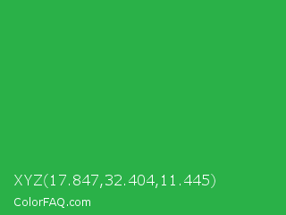 XYZ 17.847,32.404,11.445 Color is a normal green color and the nearest color is Wageningen Green #34b233. Hex code #2ab148 and RGB value is rgb(42,177,72). In RGB color space, this color is composed of 16% red, 69% green, 28% blue, In CMYK color space, this color is composed of 76% cyan, 0% magenta, 59% yellow , 31% black , In HSL color space, this color has a hue angle of 133° , 62% saturation and 43% lightness.