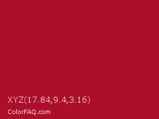 XYZ 17.84,9.4,3.16 Color is a normal red color and the nearest color is Shiraz #b20931. Hex code #ad0f2b and RGB value is rgb(173,15,43). In RGB color space, this color is composed of 68% red, 6% green, 17% blue, In CMYK color space, this color is composed of 0% cyan, 91% magenta, 75% yellow , 32% black , In HSL color space, this color has a hue angle of 349° , 84% saturation and 37% lightness.