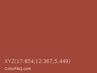 XYZ 17.854,12.367,5.449 Color is a normal red color and the nearest color is Chestnut #954535. Hex code #a2463a and RGB value is rgb(162,70,58). In RGB color space, this color is composed of 64% red, 27% green, 23% blue, In CMYK color space, this color is composed of 0% cyan, 57% magenta, 64% yellow , 36% black , In HSL color space, this color has a hue angle of 7° , 47% saturation and 43% lightness.
